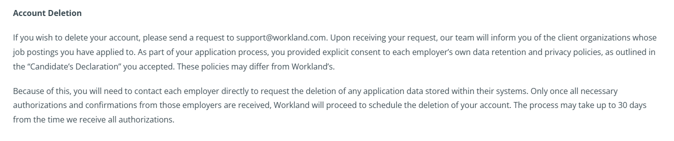 Please note that the deletion of a candidate account can only be carried out once we have received the necessary authorizations from the employers to whom you submitted your application, confirming that they authorize us to delete your data from their systems. Rest assured, your data will be handled with the utmost care and in compliance with our strict privacy policies.