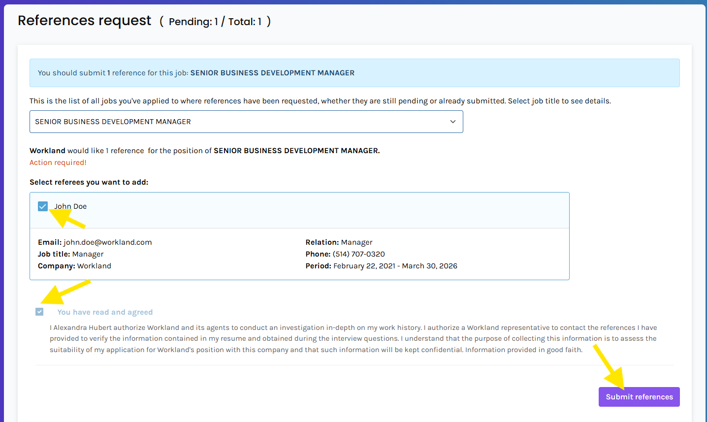 Once you're ready to send your references, in the Reference Request tab, select your referees, agree to the terms and conditions, and submit them for the employer to receive.