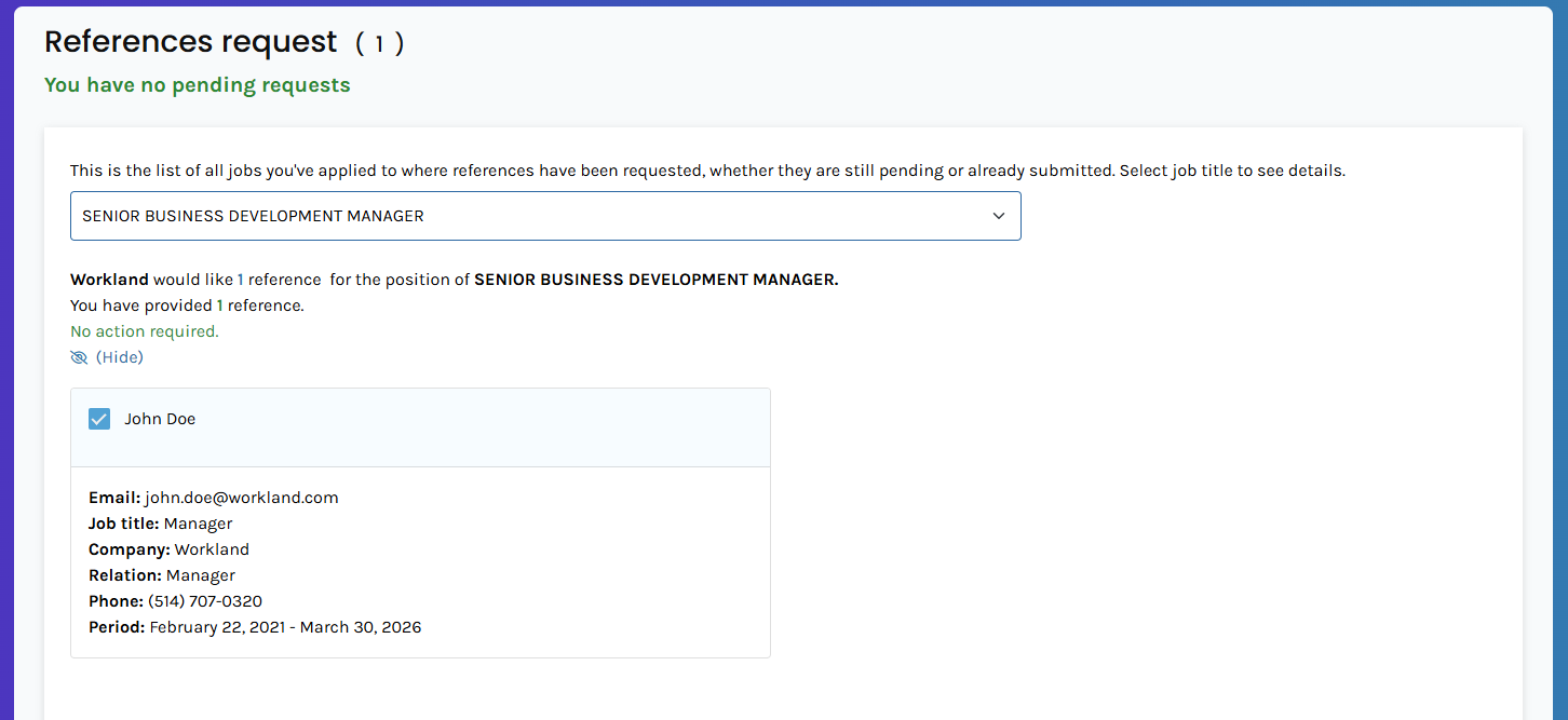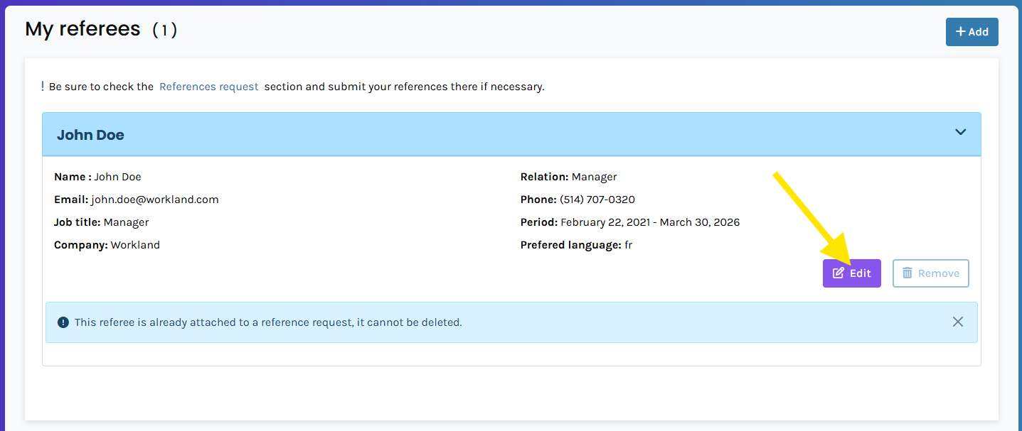 A: Once the references have been submitted, you can edit your referee until they are contacted by the recruiter. Make sure you verify all information beforehand. If a mistake is known and the edit option is no longer possible, contact the employer directly. They can add references on their side if needed.