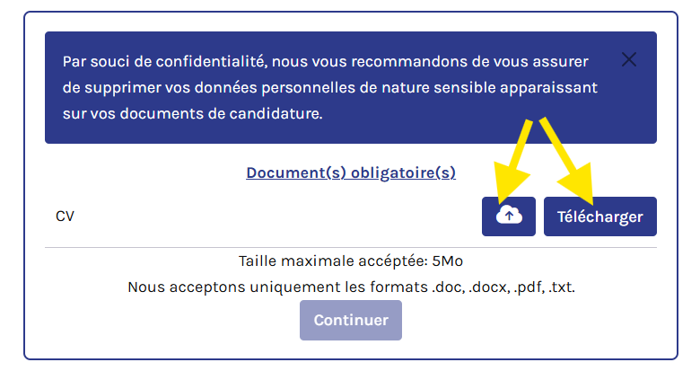 Par la suite, vous pourrez cliquer sur "Télécharger" pour pouvoir téléverser à nouveau le bon document. L'option de téléchargement par nuage est disponible si vous êtes connecté à votre portail candidat et que vous avez déjà téléchargé des documents dans le passé.