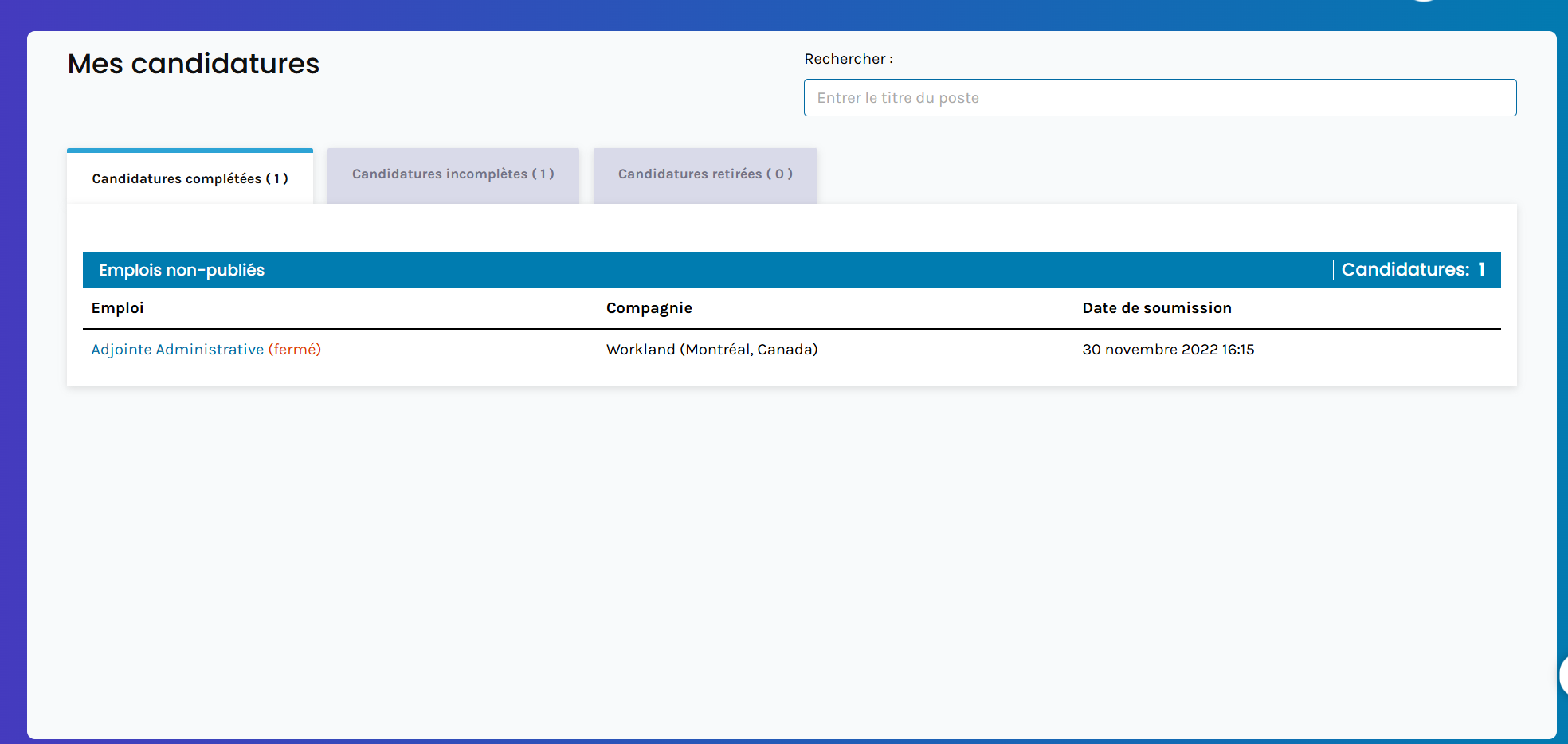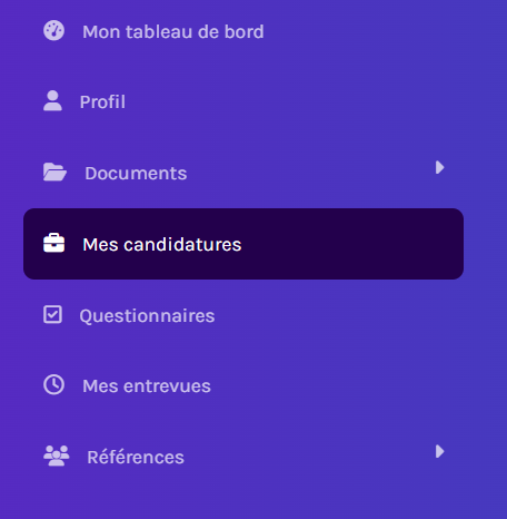 Dans la section Mes candidatures, vous pourrez voir la liste des emplois pour lesquels vous avez soumis une candidature, ainsi que ceux dont la candidature est toujours incomplète.